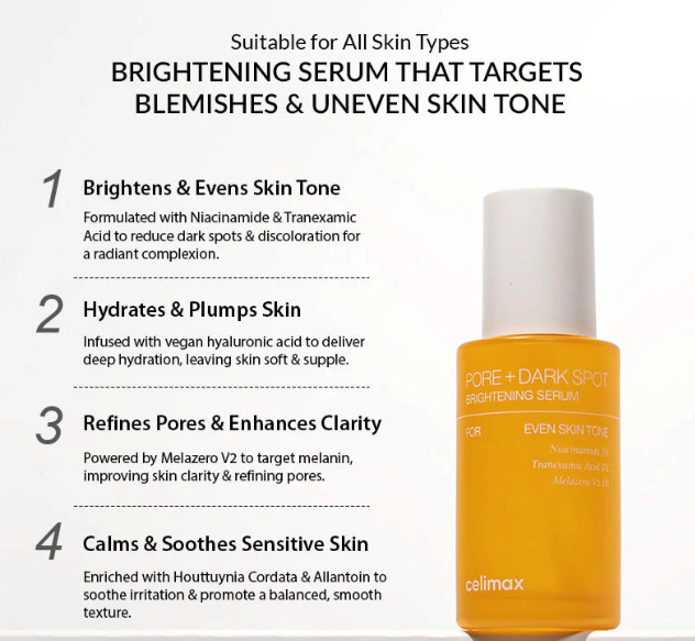 - Deep Hydration: Enjoy a moisturizing, complexion-illuminating serum that deeply hydrates your skin. The vegan hyaluronic acid formula ensures ample moisture, making it perfect for daily use. Celimax Pore+Dark Spot Brightening Serum 30ml Korean Skincare Bulk Supplier