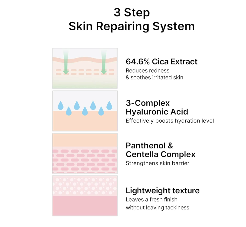 - Centella Asiatica Extract: Known for its soothing and regenerative effects, it helps heal and regenerate the skin.