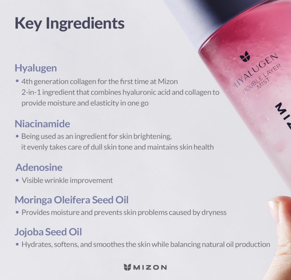 • Natural Ingredients: In addition to hyaluronic acid and collagen, it contains nourishing Moringa and Jojoba Seed Oils to condition skin without clogging pores or causing breakouts. Skin irritation index 0.00. MIZON Hyalugen Double Layer Mist with Hyaluronic Acid Korean Skincare (3.38 oz)