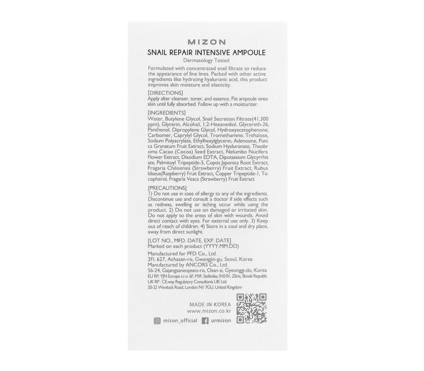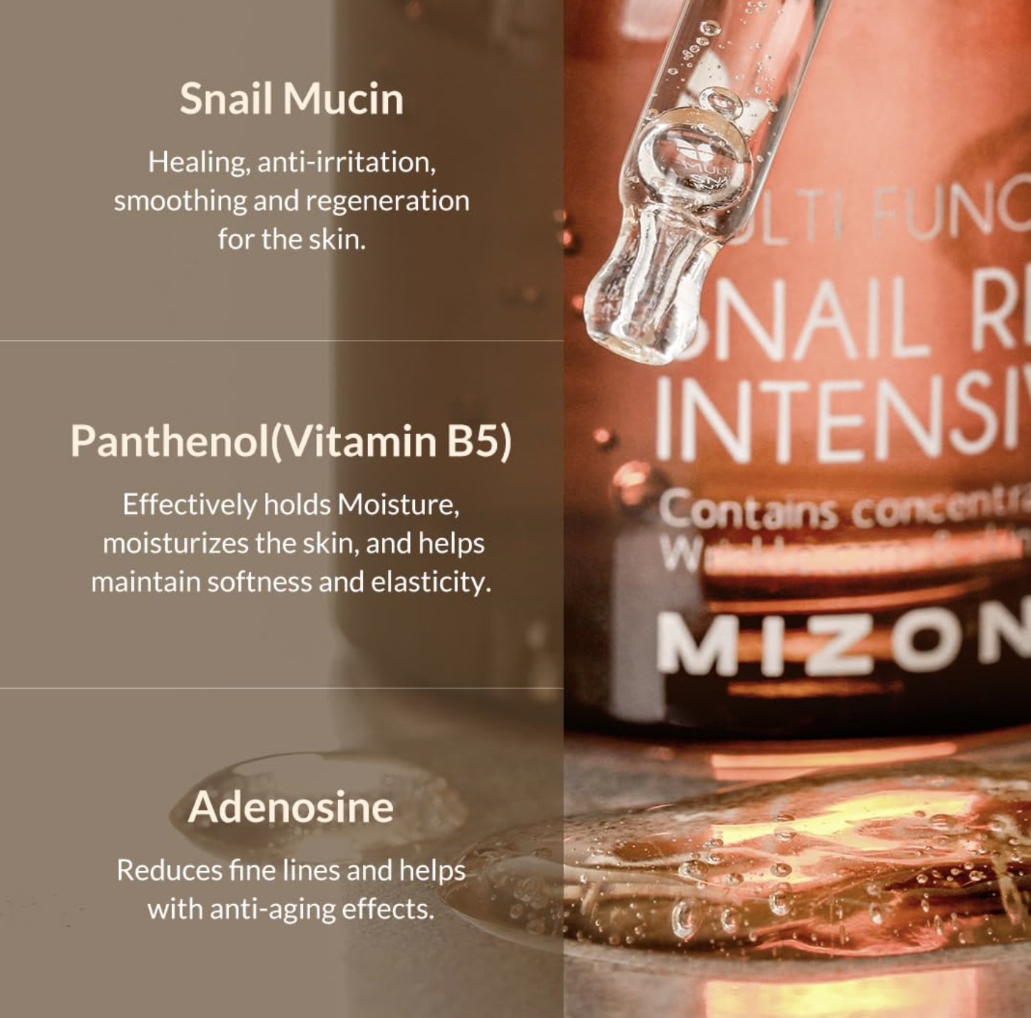 - Gentle Yet Effective for All Skin Types : With a soothing formula free from irritation, it’s perfect for sensitive, dry, or mature skin. Targets key concerns like dehydration, loss of firmness, and uneven texture. MIZON Snail Repair Intensive Ampoule with Snail Mucin Hydrating & Wrinkle Care Serum Korean Skincare (1.01 fl oz)